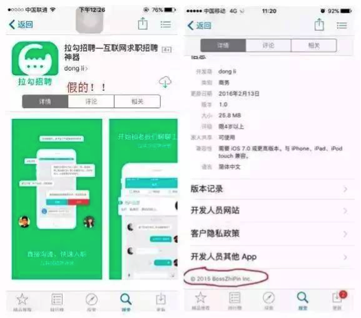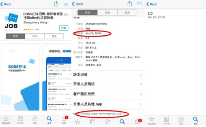 这招小技巧在业内已经使用了很长时间,通过上传与竞品类似的马甲蹭流量,具体操作是更改包名和应用名,还有截图和描述,但用户下载App打开后其实是另外一个App。“Boss直聘”做“拉勾招聘”,“拉勾”做“Boss在线招聘”便是如此。其实双方做马甲的技术很low,开发人员网站竟然链接到自己的网站,这不是此地无银三百两,做坏事还留证据;另外,开发人员网站的导流能力很弱,这个三级入口可以直接忽略。如果发现有竞品肆意利用违规手段蹭量,可以直接向苹果投诉,虽然苹果不会直接受理,但邮件的警告性还是能让不少企业住手(侵权投诉邮箱:AppStoreNotices@apple.com)