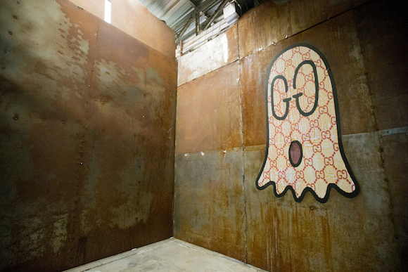 涂鸦也完全符合 Andrew 本人的气质,他是个纹身的嘻哈年轻人。在他创作了大量街头涂鸦和绘画作品中,Gucci 举足轻重,比如一个 GucciGhost 的幽灵图案就是他最为人熟知的勋章。他把 Gucci 画在一切可能的地方,浴室、垃圾箱或者马桶,慢慢地成为了 Andrew 工作室的主要风格。