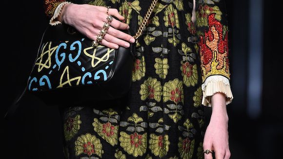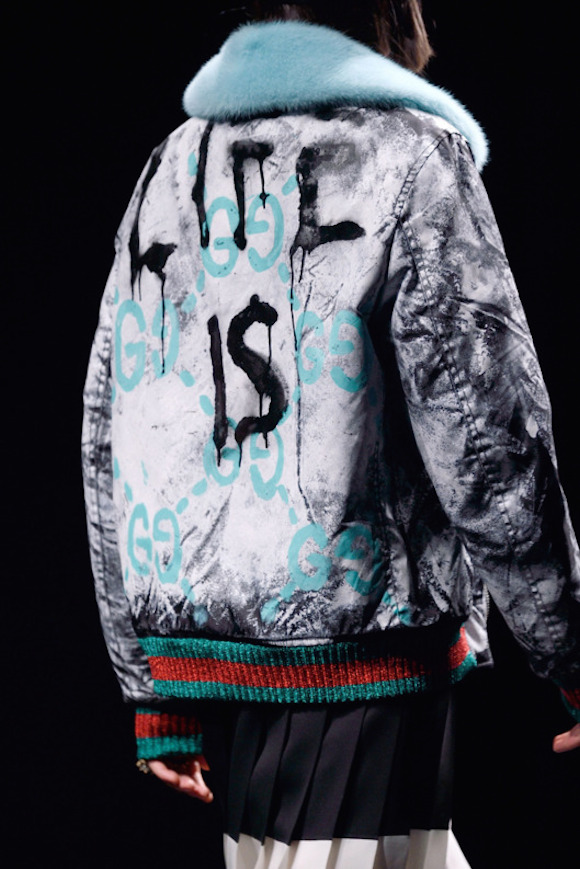 这两天,Gucci 再次点燃了米兰。虽然色彩饱满和富有细节依然不变,不过明眼人都发现了一些新东西,那就是 Alessandro Michele 在包袋和某些外套背面增加的街头元素。机车夹克和中长裙装上,出现了涂鸦样式的双G标志,加上皮革反光的质感,传递出了一股浓浓的“油漆未干”的街头味道。
