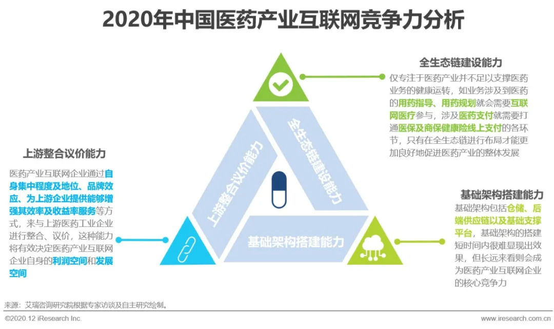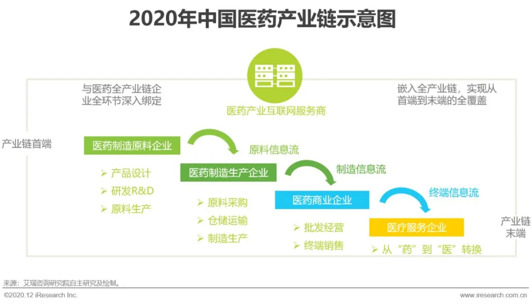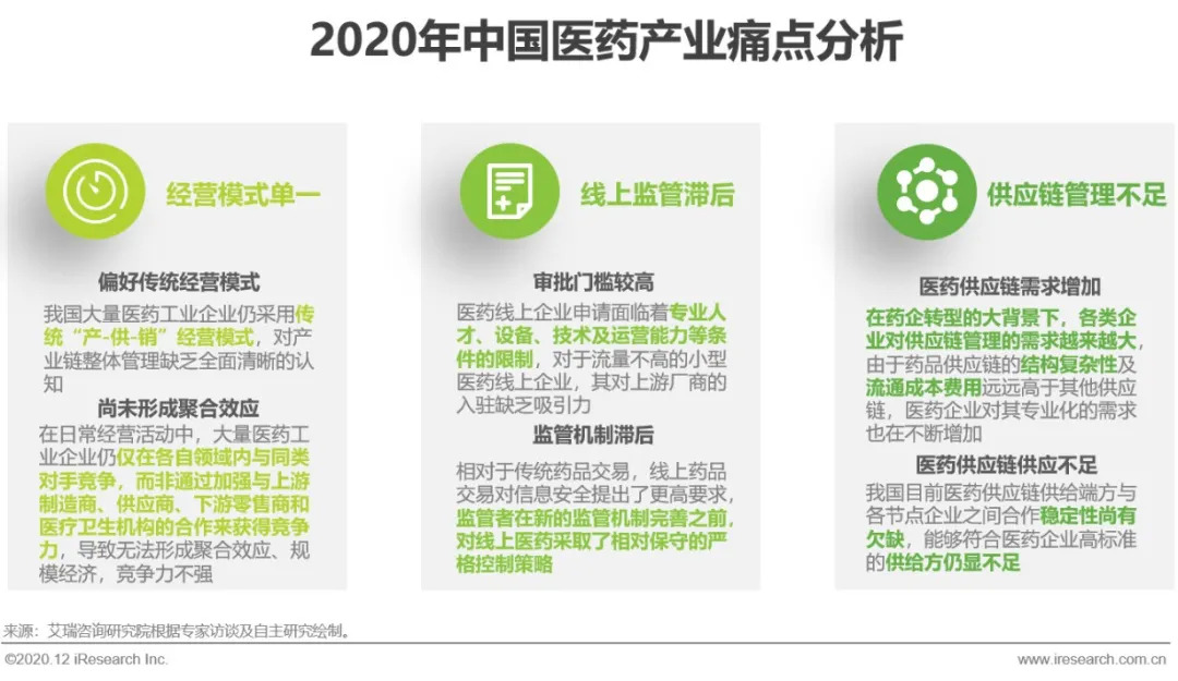 我国传统医药产业痛点主要集中于:1)经营模式过于单一;2)线上监管滞后;3)供应链专项管理的不足。艾瑞认为,市场亟需能够全面协同融合创新,助力整个产业链升级并能够符合医药企业高标准的供给平台角色的不断发力。
