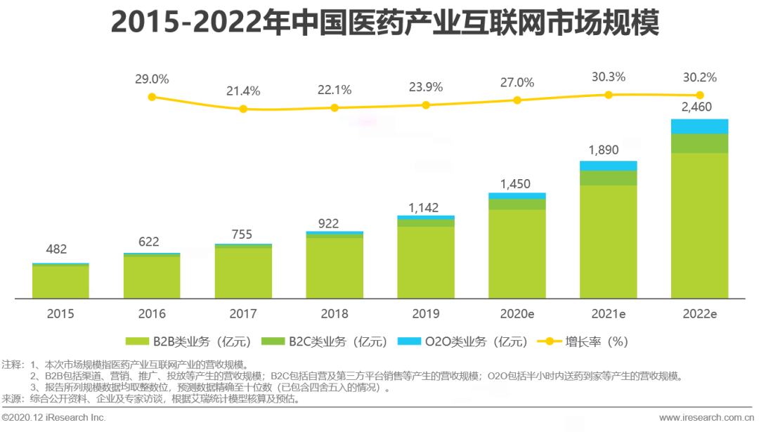 2020年我国医药产业互联网市场规模预期将达到1,450亿元,同比增长27.0%,其中,B2B类业务市场规模占比最大,达到84.3%。B2B类营收主要包括渠道佣金返点收入、营销销售收入以及对上游医药工业企业的推广、投放收入等。由于受国家于2019年末放开对线上处方药售卖的限制的政策影响以及2020年疫情的影响,艾瑞认为医药产业互联网市场规模将持续增长,同时市场将迎来快速发展期,预计市场规模增速也将不断增长。