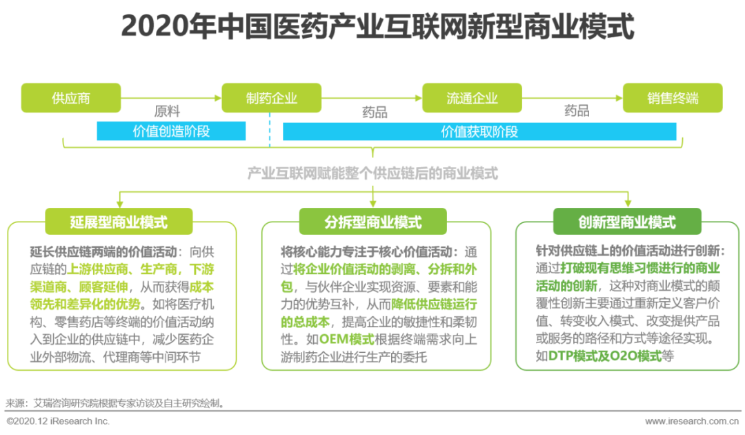 医药产业互联网除主要以赚取药品差价费,厂家促销和返利费及物流配送费等传统商业模式之外,已在不断探索新型商业模式。新兴的商业模式目前主要包括供应链延展型商业模式,供应链分拆型商业模式及供应链创新型商业模式三类,通过对全供应链的管理来实现服务盈利。供应链管理是以市场和客户需求为导向,供应链上各节点企业根据终端客户的需求,本着合作共赢的原则、以增加市场份额、提升客户满意度、增强产业竞争能力为目标,通过与医药供应链中上下游企业的协同合作,为满足终端客户需求而提供增值性的创新服务,并不断地进行最终产品或执行方案的协同创新。