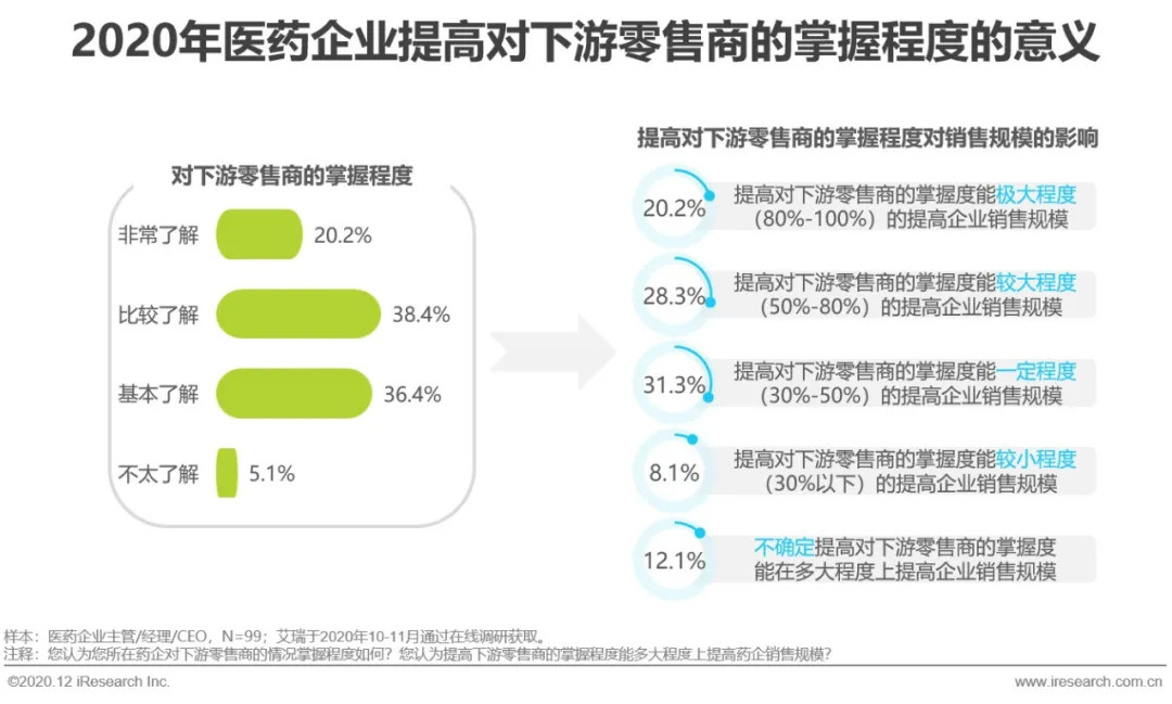 目前,调研企业基本都能掌握下游零售商的药品销售、需求等情况,仅有5.1%的调研企业缺乏对零售商的把控。但是,企业对零售商的掌握程度有限,58.6%的企业持“非常了解”及“比较了解”态度。对于“提高企业对零售商的掌握程度在多大程度上影响了企业销售规模”这个问题,48.5%的调研对象持乐观态度,认为提高对下游零售商的掌握程度能极大或较大的提升企业销售规模;仅有不到一成的调研对象对此持相对悲观态度,认为提高企业对下游零售商的掌握程度对提高企业销售规模作用不大;另有12.1%的调研对象对此问题持模糊态度。艾瑞认为,药企与产业互联网的合作也将随着对提高下游零售商掌控程度的需求增加而不断增加。