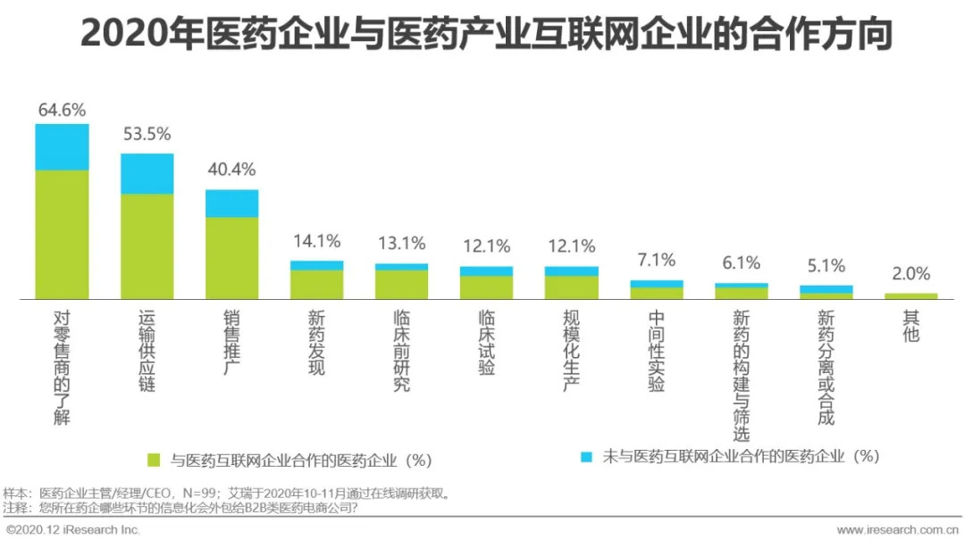 艾瑞调研:医药产业互联网企业为各类医药企业搭建信息化平台,助力医药企业协同创新,构建新型商业模式。调研企业中,超六成企业与产业互联网企业展开合作,仅有16.2%的企业从未与其合作;药企与医药产业互联网企业合作的主要方向在于对零售商信息的掌握(64.6%)、运输供应链(53.5%)以及销售推广(40.4%),目前合作服务主要集中于产业链的中下游。