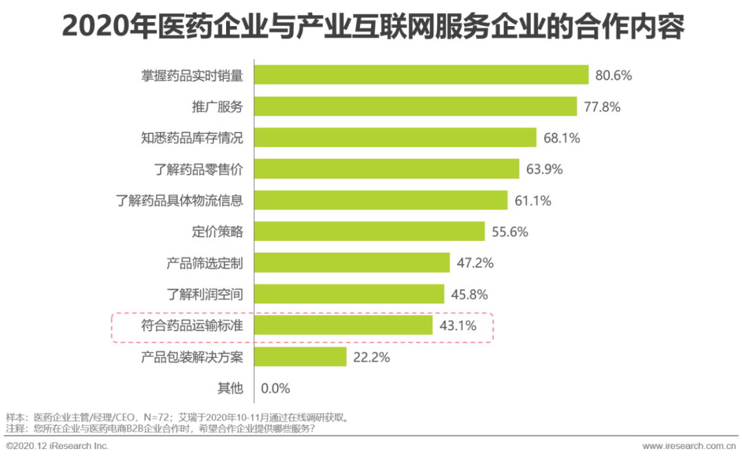 根据艾瑞调研结果,2020年中国医药企业与产业互联网企业的合作内容主要聚焦于掌握实时销量(80.6%)、推广服务(77.8%)以及掌控药品库存情况(68.1%),现有合作内容中以掌握下游信息以及增强推广宣传力度为主,对于符合药品运输标准的合作仅有43.1%。但是对于未与医药产业互联网企业合作的药企而言,其对符合药品运输标准的需求高达77.8%,位列潜在合作内容的第一位。艾瑞认为,这说明了医药产业互联网企业需要进一步提高自己在运输标准方面的服务能力,以增加其与更多药企合作的机会。