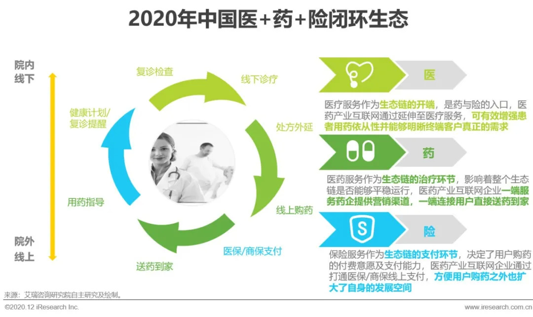 随着医疗大健康行业的逐步发展,大健康行业整体的不可分割性愈加凸显,痛点也愈加明显,如单纯的在线问诊,医药线上购买并不能解决患者的真正需求,患者对于如何进行下一步诊疗、用药等仍会心存疑问。医药产业互联网企业作为拥有强大科技赋能能力的一类企业,在全生态布局上有着先天优势,通过将原本医药治疗链逐渐向上游的支付、诊疗以及下游的管理、复诊提醒相结合,形成生态链的完整闭环,在增加患者用药依从性的前提下还可获知用户对于大健康的真正需求,并作出调整,助力大健康产业整体的快速健康发展。
