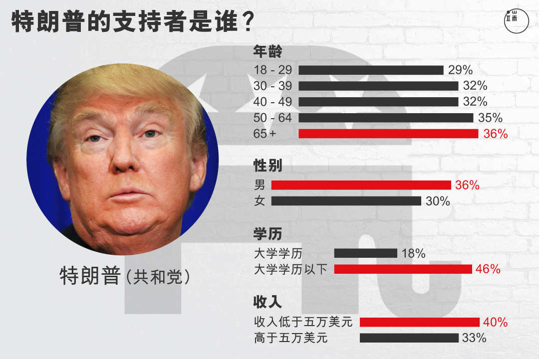 有调查显示,特朗普的“粉丝”以年纪较大、低学历的白人男性为主。91%的支持者是白人,58%为男性。约一半的支持者为45岁至64岁,34%的人为65岁以上,只有2%是30岁以下的年轻人。三分之一的支持者为高中及以下学历。不同于传统的高收入共和党支持者,超过三分之一的特朗普支持者年收入低于五万美元,大多从事蓝领工作。