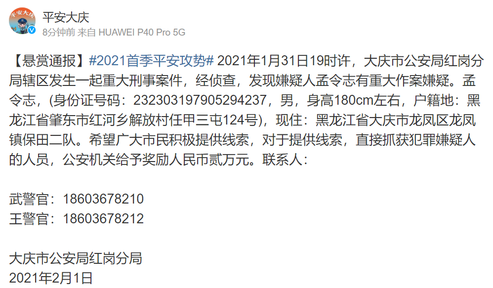 据@平安大庆 微博消息,2021年1月31日19时许,大庆市公安局红岗分局辖区发生一起重大刑事案件,经侦查,发现嫌疑人孟令志有重大作案嫌疑。孟令志,男,身高180cm左右,户籍地:黑龙江省肇东市红河乡解放村任甲三屯124号),现住:黑龙江省大庆市龙凤区龙凤镇保田二队。希望广大市民积极提供线索,对于提供线索,直接抓获犯罪嫌疑人的人员,公安机关给予奖励人民币2万元。