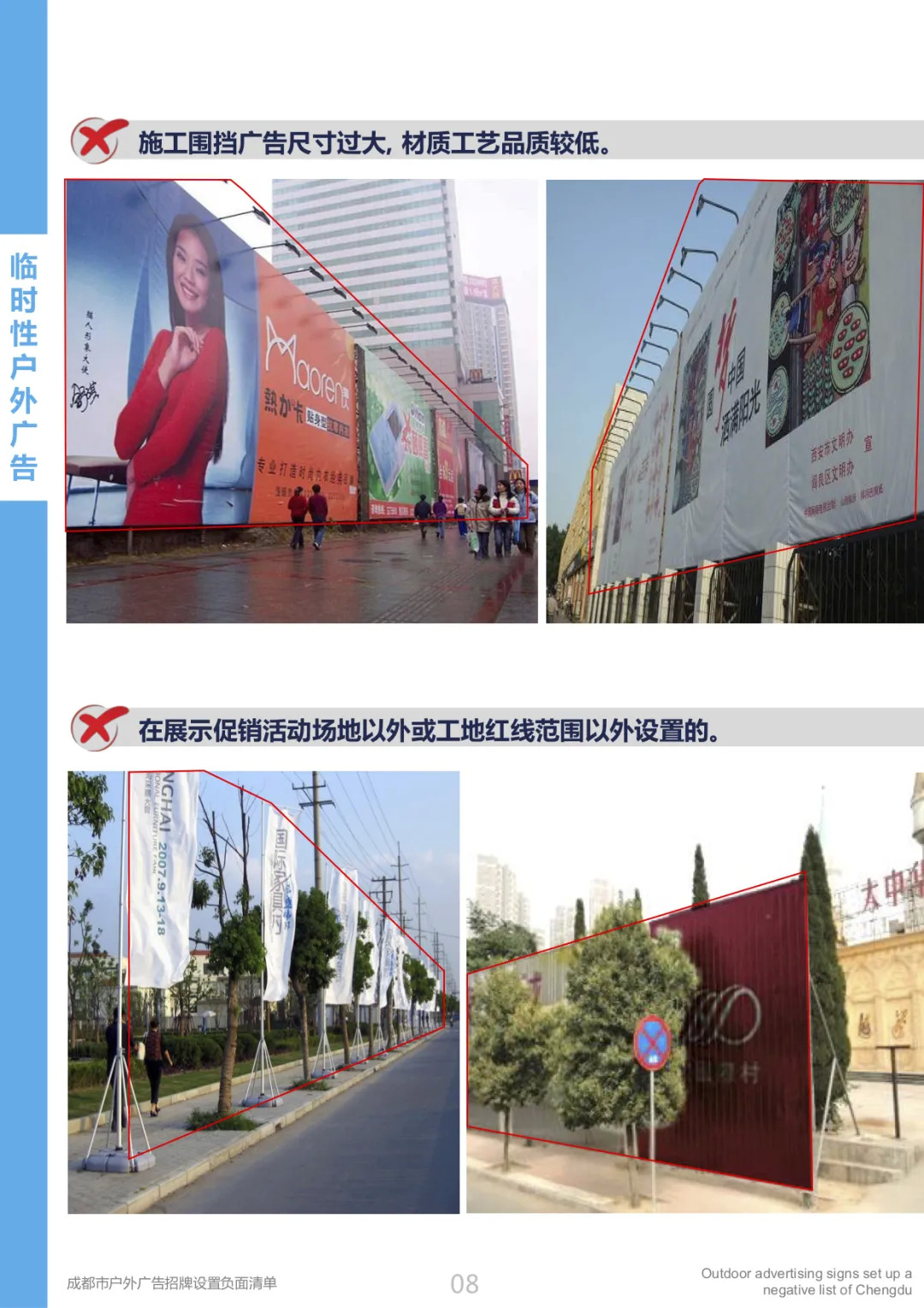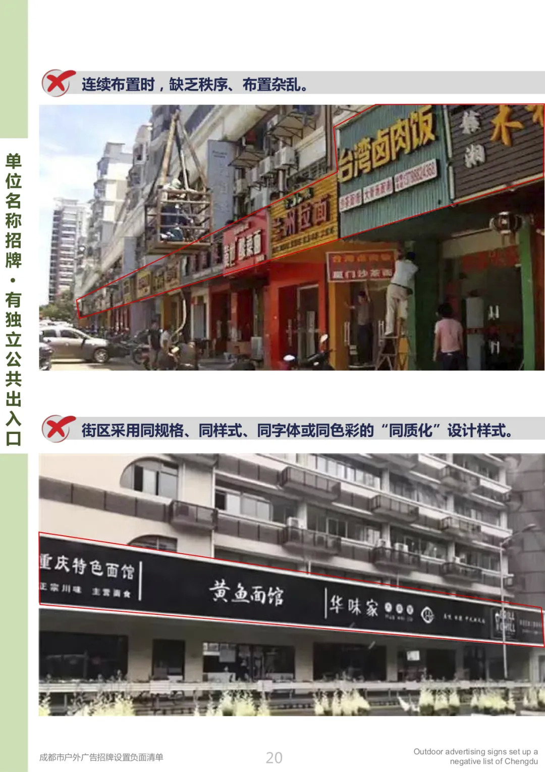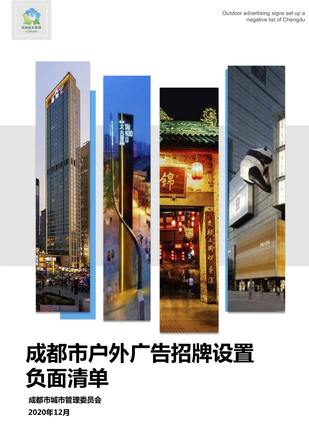 为进一步规范户外广告招牌设置管理,依据《成都市户外广告和招牌设置管理条例》等相关规章、办法及规范,2020年12月,成都市城管委制定了成都市户外广告招牌设置管理负面清单。以便强化规范设置指引,引导户外广告招牌设置充分体现人文精神、遵循商业规律、彰显城市美学,促进广告招牌与城市街区相协调,与产业形态相和谐,呈现城市特色,促进商业繁荣,提升城市容貌环境品质。