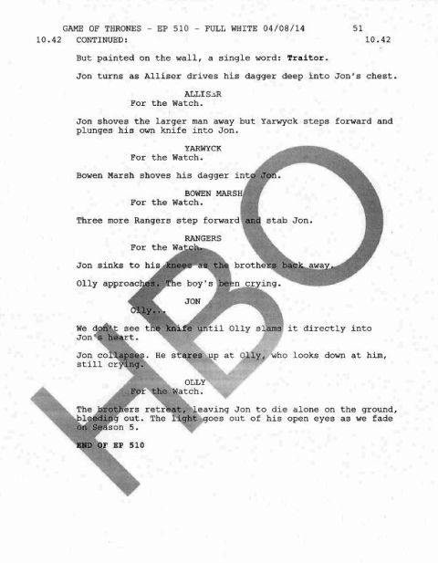 《娱乐周刊》最近在网站上公布了《权力的游戏》第五季剧本的最后几页,而这几页剧本中的内容表示了一个信息,至少在第五季最后的镜头里,琼恩·雪诺确实死了。