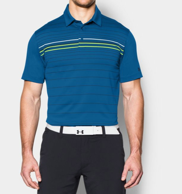 售价74.99美元的上衣,UA coldblack Engineered Stripe Men's Golf Polo。当高尔夫球手都喜欢穿着颜色鲜艳的上衣参赛时,斯皮思更倾向于低调沉稳的配色。