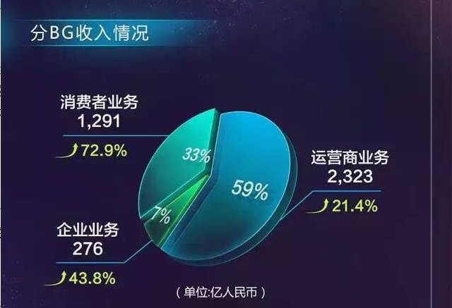 2015年华为运营商业务收入2323亿元,同比增长21%;企业业务收入276亿元,同比增长44%;而曾经不起眼的消费者业务在2015年异军突起,收入达1291亿元,同比大增73%。