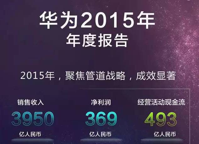 2015年华为全年销售收入3950亿人民币(约608亿美元),净利润达369亿元人民币(约合57亿美元)。