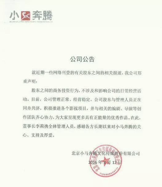 2015年10月31日,金燕通过微博发布声明:10月29日傍晚,公司股东未经授权直接从公司带走小马奔腾的公章,同时小马奔腾及其子公司全部营业执照的正副本原件均不翼而飞;11月3日,小马奔腾发布公告称,经股东大会及董事会讨论决定,公司法定代表人由金燕女士变更为李莉,任命李莉为公司董事长。