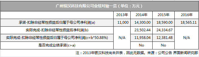 界面新闻再次测算,按照当初2013年约定的扣非后归属于母公司净利润来测算,2014年以及2015年银汉的业绩均未达标。