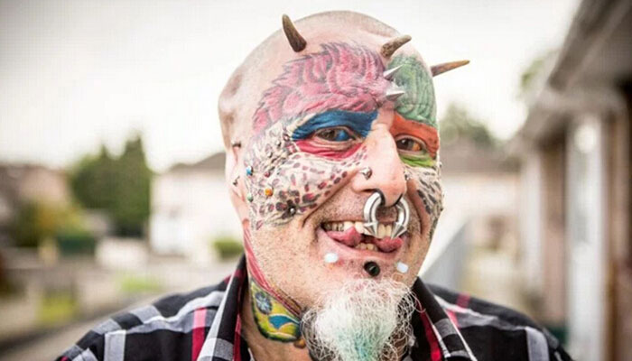 他的身上有110处文身,50个穿孔,而且还做了蜥蜴舌头。他通过手术移除了两只耳朵,给眼球染了颜色,并且给自己移植了犄角,这样他看起来就更像是一只鸟了。