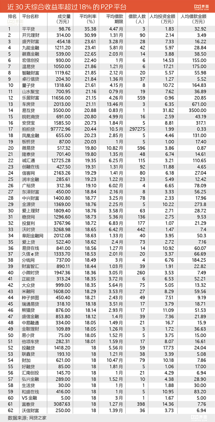 界面新闻查询网贷之家最新统计数据发现,在2461家正常运营的平台中,近30天年化收益率达到或超过18%的平台仍有62家。