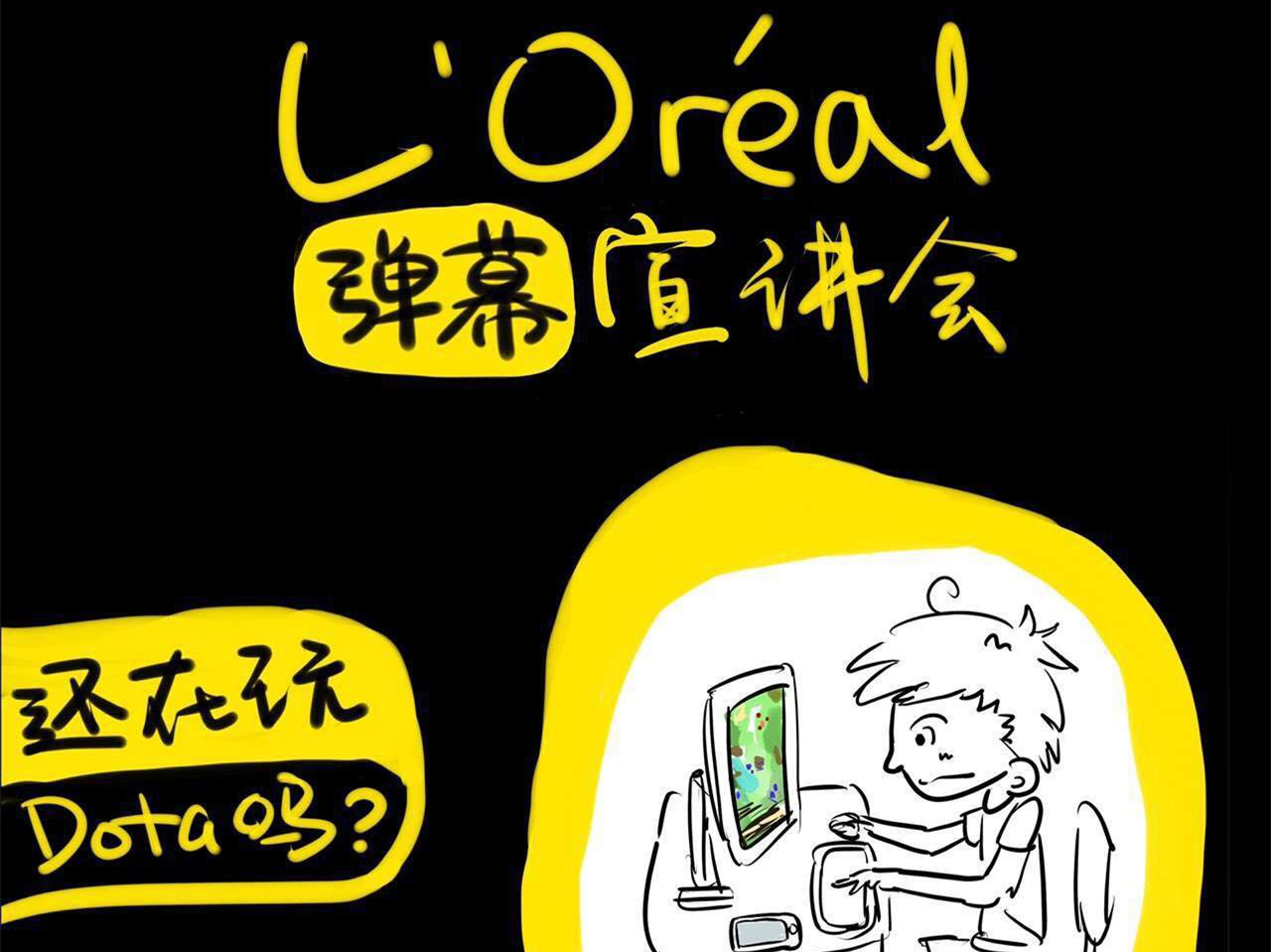 在宣讲会的前一周,欧莱雅还特地制作了针对B站二次元们的海报。在黑底黄边、还配上了4幅简笔漫画的宣传海报上,他们这样写道:“还在玩Dota吗?来B站宣讲会Level Up;关掉自恋-App,来欧莱雅做无敌美少女。”