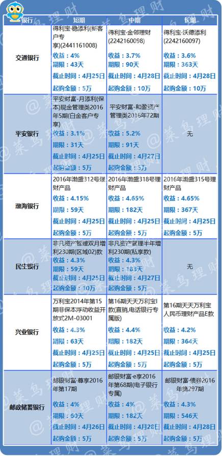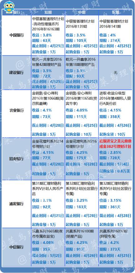 银行理财产品风险非常小,主要看收益。短期:3个月以内;中期:3个月~1年;长期:1年以上。