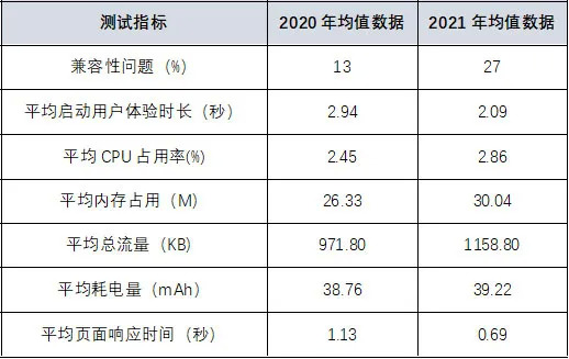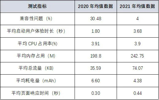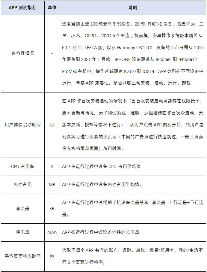 本次测试共分为APP兼容性测试、性能测试、其他测试三大方面,共7个指标。包括主流手机设备兼容情况、APP用户体验启动时间、CPU占用率、网络流量、内存占用、电量消耗、5个典型页面的响应时间。