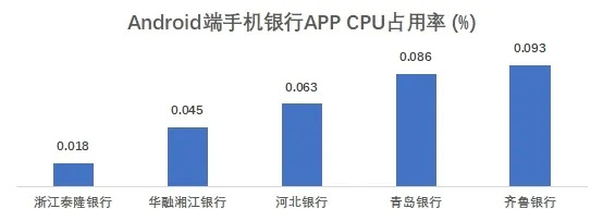 73家城商行安卓和IOS客户端APP CPU占用率均在25%以内,CPU太高会导致使用发烫和耗电,在非WiFi环境下功耗要更大,直接影响用户使用感。在安卓客户端,APP 运行时的CPU占用率在0.018%到21.347%不等,平均占用为3.90%,中位数为3.34%,最高占用为21.347%。其中,浙江泰隆银行手机银行APP CPU占用率最低,运行时平均占用仅为0.018%。