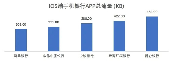 在IOS客户端,73家城商行APP 运行时2分钟随机点击消耗总流量309KB到1963KB不等,平均消耗1158.8KB,较去年同业流量消耗有小幅增长,中位数为1038KB,最高为1963KB。其中,最低流量消耗为河北银行手机银行APP,运行消耗流量仅为309KB。