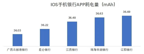 IOS客户端APP 运行时2分钟随机点击消耗总电量36.03毫安到41.99毫安不等,平均消耗39.22毫安,中位数为39.09毫安,最高消耗为41.99毫安。最低电量消耗是广西北部湾银行手机银行APP,运行消耗36.03毫安。