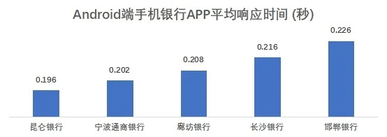 73家城商行在安卓和IOS客户端APP页面的平均响应时间较快。安卓客户端,手机银行APP“账户”、“理财产品”、“缴费”、“转账”和“我的页面”平均响应时间从0.196秒到1.032秒不等,平均为0.44秒,中位数为0.4秒,最慢为1.032秒。其中,响应时间最短的是昆仑银行手机银行APP,仅为0.196秒。
