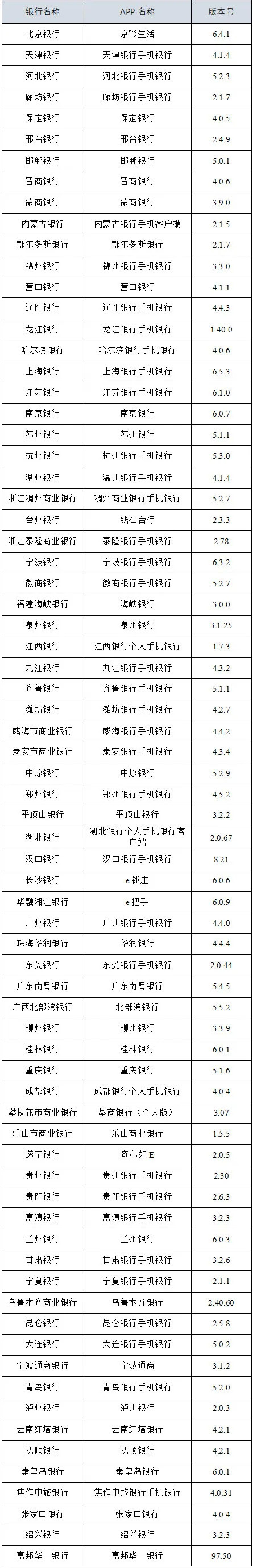 本次测试包含73家城商行的个人手机银行安卓和IOS手机客户端,包括了(银行顺序随机排布)