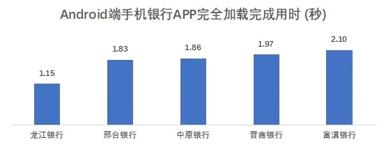 在安卓客户端,73家城商行启动用户体验时间分布在1.15秒到9.21秒之间,差别较大,平均为3.68秒,平均用时较去年翻了一倍,中位数为3.45秒,最大为9.21秒。其中,龙江银行手机银行APP启动用户体验时间最短,从用户点击APP图标到可操作的首页面完全加载完成仅用时1.15秒。