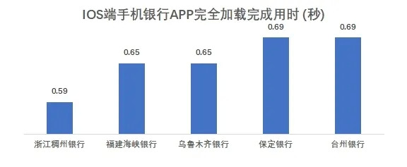 在IOS客户端,73家城商行启动用户体验时间分布在0.59秒到5.77秒之间,平均为2.09秒,较去年近3秒有较大提升,中位数为1.89秒,最大为5.77秒。其中,浙江稠州银行APP启动用户体验耗时最短,从用户点击APP图标到可操作的首页面完全加载完成用时为0.59秒。