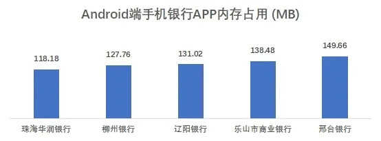 在安卓客户端,73家城商行APP 运行时内存占用是118.18MB到435.95MB不等,平均占用为242.75MB,较去年性能消耗提升22%,中位数为239.12MB,最高占用为435.95MB。其中,最低内存占用为珠海华润银行手机银行,运行时平均占用118.18MB。