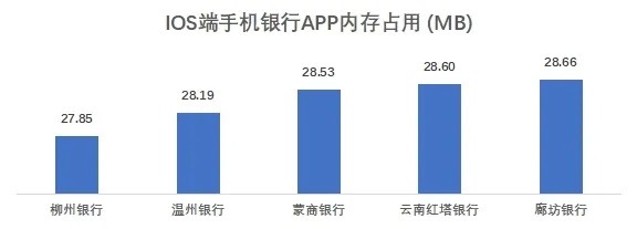 在IOS客户端,73家城商行APP 运行时的内存占用是27.85MB到34.49MB不等,差距较小,平均占用为30.04MB,中位数为29.71MB,最高占用为34.49MB。其中,最低内存占用为柳州银行手机银行APP,运行时平均占用27.85MB。
