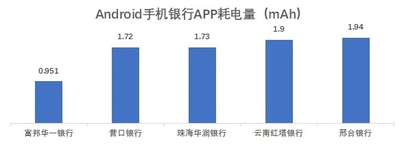 73家城商行安卓和IOS客户端APP电量消耗均在可接受范围内,安卓端平均耗电量较去年增加近一倍。其中,安卓客户端APP 运行时2分钟随机点击消耗总电量0.951毫安到20.1毫安不等,平均消耗4.37毫安,较去年有小幅优化,中位数为3.19毫安,最高消耗为20.1毫安。最低电量消耗为富邦华一银行手机银行APP,运行消耗仅为0.951毫安。