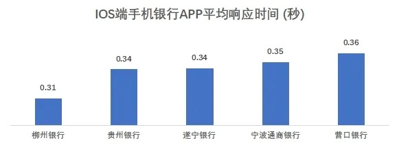 在IOS客户端,手机银行APP在“我的账户”、“转账”、“理财”、“信用卡”和“生活页面”的平均响应时间从0.31秒到2.16秒不等,平均为0.69秒,较去年提速近1倍,中位数为0.64秒。其中,平均响应时间最短的是柳州银行手机银行APP,为0.31秒。