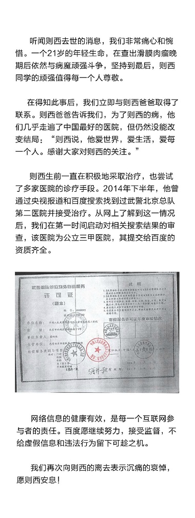 此外,今日凌晨1点,百度推广发布微博回应称:针对网友对魏则西所选择的武警北京市总队第二医院的治疗效果及其内部管理问题的质疑,我们正积极向发证单位及武警总部主管该院的相关部门递交审查申请函,希望相关部门能高度重视,立即展开调查,如果调查结果证实武警二院有不当行为,我们全力支持则西家属通过法律途径维权。