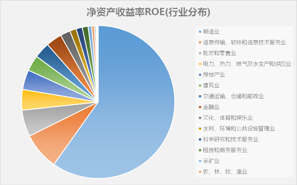 从证监会行业分布来看,制造业和信息传输等行业是盈利能力较高的行业。2015年净资产收益率超过6.8%的上市公司中,有875家为制造业,115家为信息传输、软件和信息技术服务业。盈利能力整体较差的是采矿业、农林牧渔以及卫生等行业。如下表: