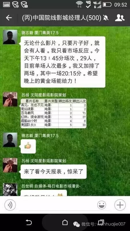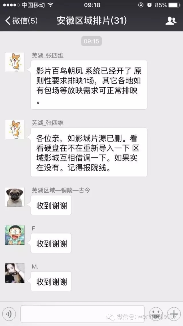 而另外一个院线老大,万达影城的某影城经理朱腾也对“文化界”表示:“万达一定会全力支持”,从聊天记录截图显示,“系统已经开了,原则性要求拍映一场,其他各地如有包场等放映需求可正常拍映。”