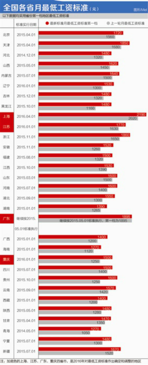 但2016年,对最低工资标准作出确定和调整的省份则大大减少。据21世纪经济报道记者不完全统计,截至今年5月14日,全国仅上海、江苏、重庆、广东等四省市对今年最低工资作了明确,且江苏、重庆更多是对2014年发布的最低工资标准作出调整。