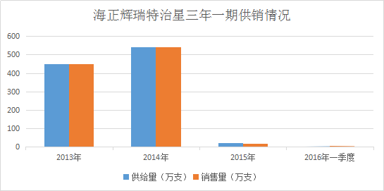 根据海正药业提供的特治星三年一期(2013-2015年、2016年1-3月)的供销数据显示,公司控股子公司海正辉瑞特治星在2013、2014年的供货量分别达到447.52万支、540.85万支。但这个数字到2015年却陡降至17.97万只,降幅超过90%。2016年一季度,特治星的供货量仅为1.7万支,而销售达2.04万支,供应远不能满足销售需求。