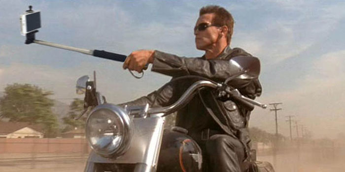 乡村小道,摩托车,飞扬的尘土加上手里的自拍杆,如果不是《终结者》里施瓦辛格这张无懈可击的帅脸,还真是和乡镇青年有点傻傻分不清楚。