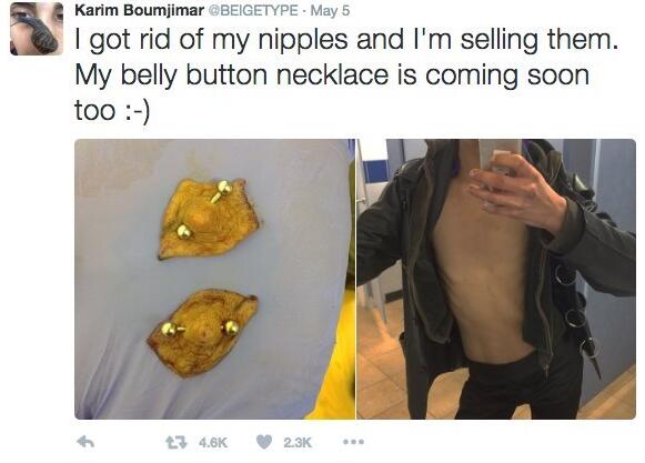 在经历了切割手术之后,卡里姆拍下自己乳头的照片(他将两个乳头制成了耳环),并将其发布到了社交媒体上。在照片中,我们能看到他的胸膛上非常干净,似乎涂抹了液体来遮掩手术后的伤疤。“我切掉了自己的乳头,并决定将它们卖掉,”他在照片下注上了一些文字,搭配那两个长得像干芒果的乳头,“下一个物品就是肚脐项链,敬请期待。”