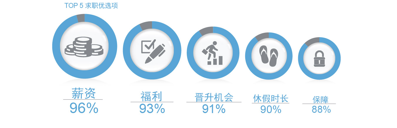 中国职场中36%的年轻人表示自己会因为得不到认可而更换工作,这一数字在全球范围内为50%。由于国内经济环境的良好态势,80%中国受访者对当前职涯前景持乐观态度,71%坚信即使明天失业,依然能够在3个月内找到同等甚至更好的工作。在更换工作过程中,九成人会受薪资福利的影响。此外,不论工作地点、工作类型,晋升机会,还是休假时长、工作保障和新技能学习,都在千禧一代考虑范围内。