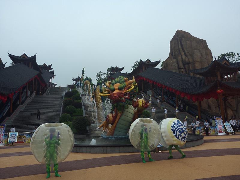 从青花瓷万达茂的东门出来,抬眼便可看到不远处的高台上,一条卡通巨龙沿阶而下。顺着两边的扶梯向上,就是南昌万达城的室外主题乐园。