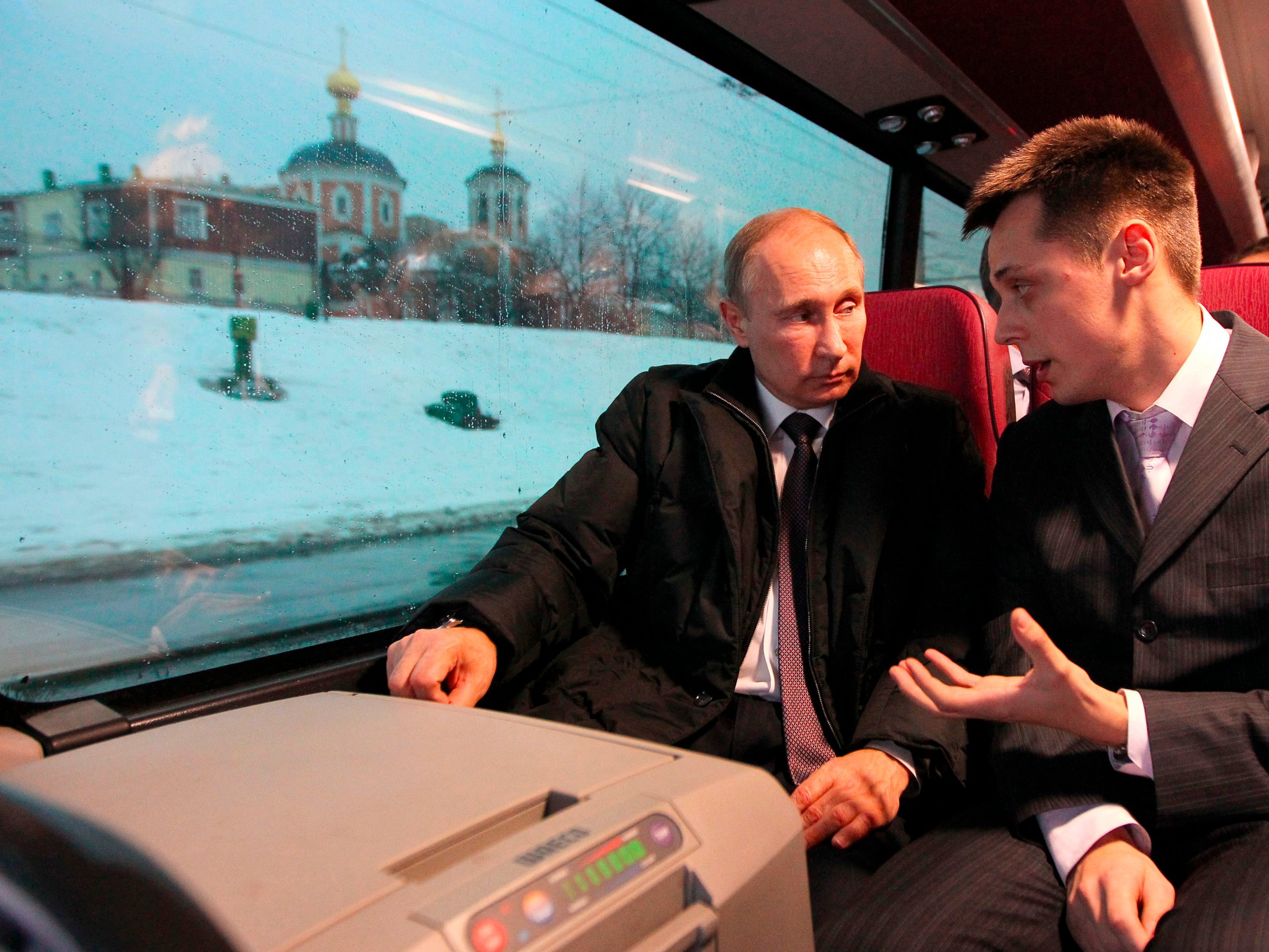 俄罗斯总统普京与波罗的海联邦大学学生在巴士上交谈,摄于2013年。