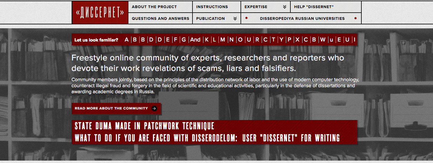 这个组织2013年由一群科学家和记者发起,主要揭露政府官员、学术界主管、俄罗斯精英人士们伪造学历的事实,他们的学术成就都是通过非法手段取得的。Dissernet使用了查询相同段落的软件,截至目前已找出5600多位论文剽窃者,并针对其中1300多人发表了谴责性的文章。