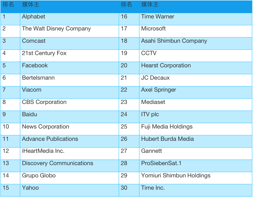 《全球 30 强媒体主报告》是唯一一份依据媒体收入做出的全球最大媒体公司榜单,由实力媒体推出。该报告自 2007 年起推出,上一版发布于2015 年。实力媒体将媒体业务收入定义为来源于支持广告业务的所有收入,从而确定媒体公司对营销行业的重要程度。