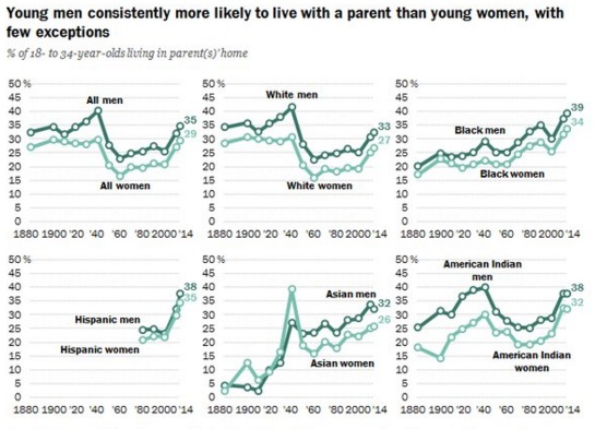 报告还显示,儿子比女儿更可能与父母同住,2014年二者的比例分别为35%和29%。无论儿子还是女儿,与父母同住的比例在1960年达到最低点约23%和16%,之后一路攀升。但儿子和女儿之间的差距在缩小,从1940年的10%缩小到2014年的6%,且无论是白人、非裔、拉丁裔、亚裔还是印第安土著都体现出这一趋势。