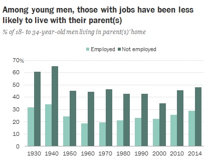 就业状况与工资是影响与父母同住比例的重要经济因素,这在年轻男性中体现尤其突出。皮尤数据显示,2014年年轻男性与父母同住的比例为35%,高于32.1%的总体水平,其中,无工作男性与父母同住的比例接近50%,而有工作的男性中这一比例低于30%。近几十年来,美国年轻男性的就业率显著下降,从1960年的84%下降到2014年的71%。而在就业状况相对较好的1960年,与父母同住的男性比例仅为23%。
