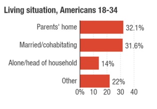 但近几十年来,晚婚及不婚成为一种潮流,婚前性行为及非婚生子女也得到社会宽容,造成了与父母同住的年轻人人数不断增加。目前,美国年轻人初婚年龄为男性29.2岁,女性27.1岁,而1956年,男性初婚为22.5岁,女性仅20.1岁。与此同时,多达四分之一的年轻人选择不结婚。